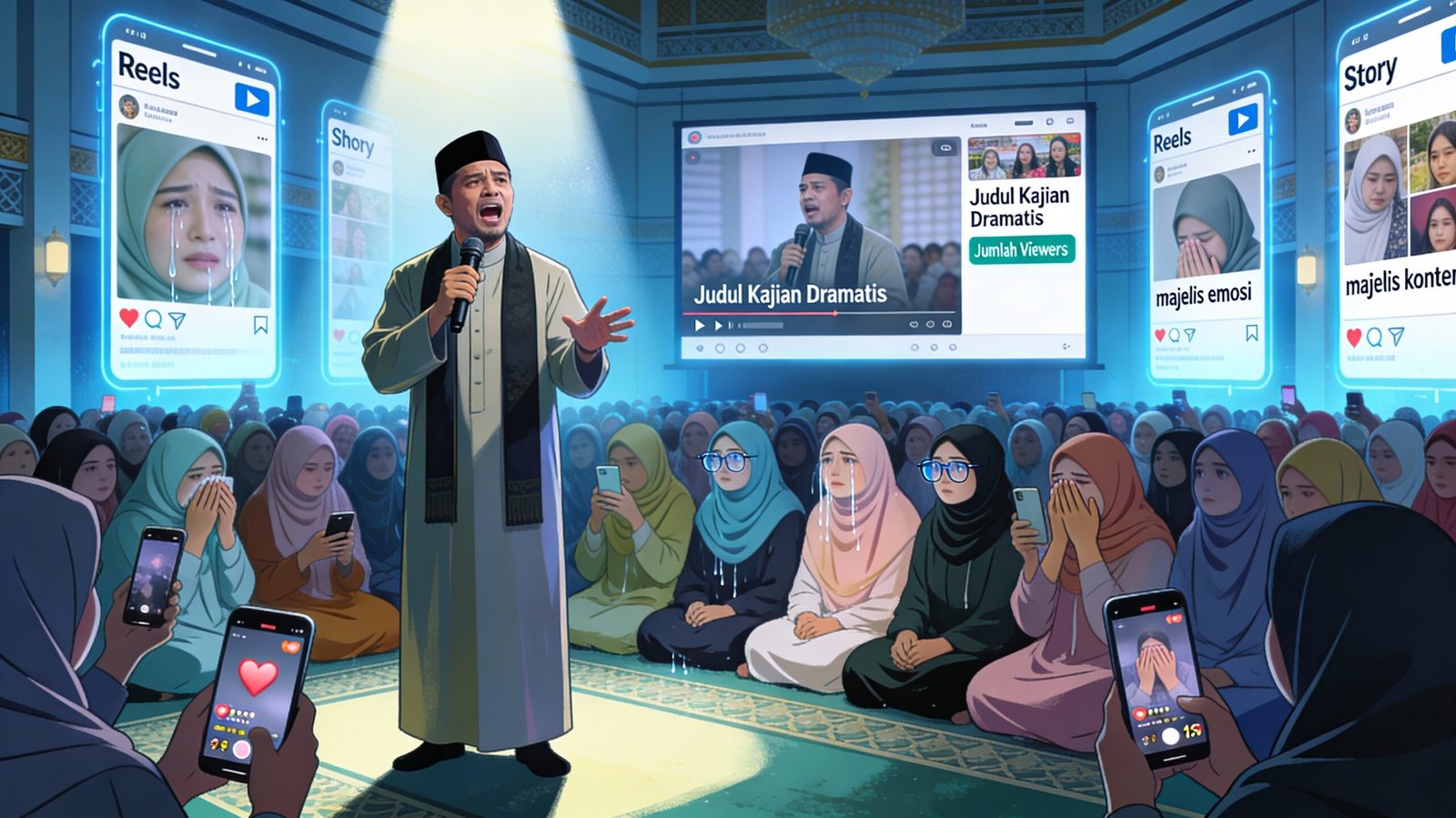 Sementara kamera ponselnya tetap menyala dengan status lagi live di beberapa akun media sosial miliknya. Pada tahap inilah, majelis ilmu tak hanya berubah menjadi majelis emosi, tetapi juga bertransformasi menjadi majelis konten. majelis yang menuntut visual yang estetik, durasi singkat, serta adegan emosi yang mudah dipotong.